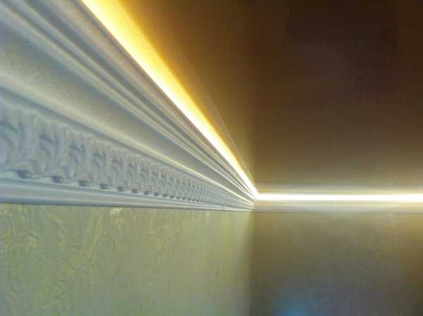 3. Третий аспект заключается в том, что на вопрос: как клеить потолочный плинтус к натяжному потолку лучше ответить, что его необходимо прикреплять к стене. В таком случае, может остаться пространство между потолком и изделием. Чтобы заполнить или убавить зазор, вероятнее всего проложить светодиодную подсветку. В таком направлении, лучше применить именно светодиоды, поскольку они не будут нагревать натяжной потолок. В случае, использования других лампочек, они будут подогревать верх, что создаст деформацию поверхности.