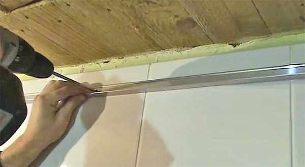 - По периметру ванной закрепляется декоративный уголок по ранее расчерченной разметке на стенах. Нужную длину уголка обрезают ножницами по металлу, после чего в нем проделываются отверстия с шагом 300–400 мм, которые переносят на поверхность стены. Крепление, как и в предыдущем случае, выполняется дюбелями и саморезами.