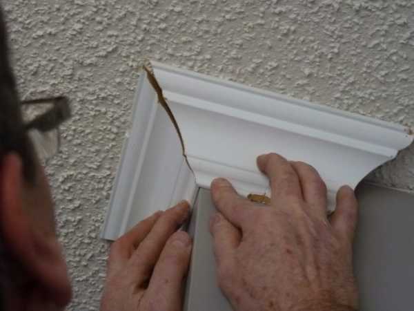 Важно! Работая с галтелями из ПВХ, пенополистирола начинать следует с лицевой стороны изделия. Так обрезка получается аккуратнее.