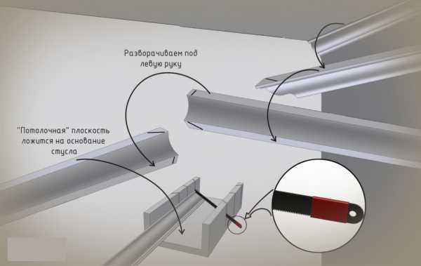 Как сделать угол потолочного плинтуса: расположение заготовки в стусле
