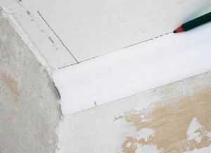 - Прежде чем приступить к поклейке галтелей, необходимо сделать разметку: измерить периметр потолка, определить места соединений плинтусов. Кроме этого, необходимо измерить угол между потолком и стеной: при ровных поверхностях он должен равняться 90 о. В этом случае смежные плинтуса должны будут резаться под углом в 45°.