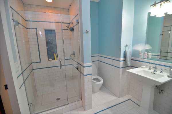 Если выбрать белый и черный, можно для плитки на пол использовать рисунок шахматной доски, но без дополнительного декорирования интерьер в целом получится скучным и монотонным. Подберите один и тот же цвет в разных тональностях: для нижней части глубокий синий, для верхней – легкий голубой бриз.