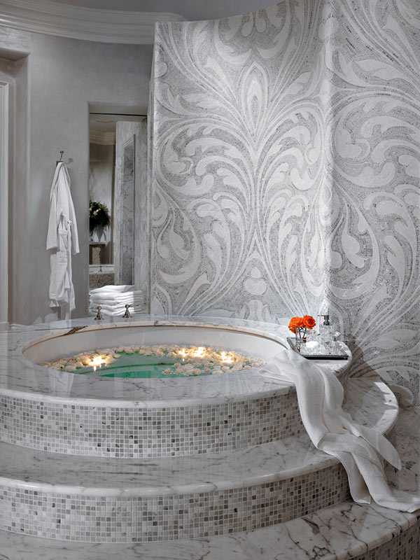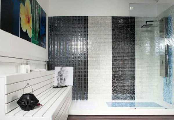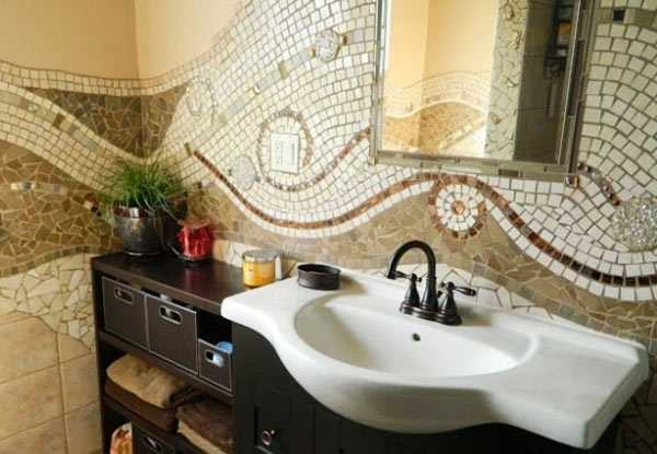 - Если конфигурация стен довольно сложна, то для их облицовки стоит выбрать плиточную мозаику.