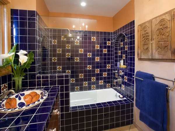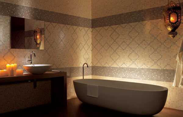 Насыщенные мотивы подходят лучше всего для просторных ванных комнат. Но если у вас небольшое помещение и вы при этом хотите обыграть комнату в восточном стиле, выбирайте плитку с неярким цветовым решением, и лучше, чтобы узор был мелким и не сильно при этом бросался в глаза.