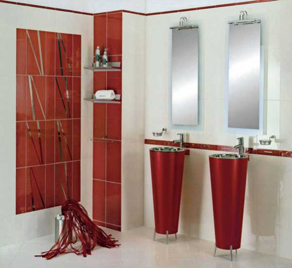 Золотая, ярко-бирюзовая, красная расцветка применяется для того, чтобы создать эффектные композиции. Но учтите: если ванную отделать полностью плиткой такой расцветки, то возникнет давящее напряжение.