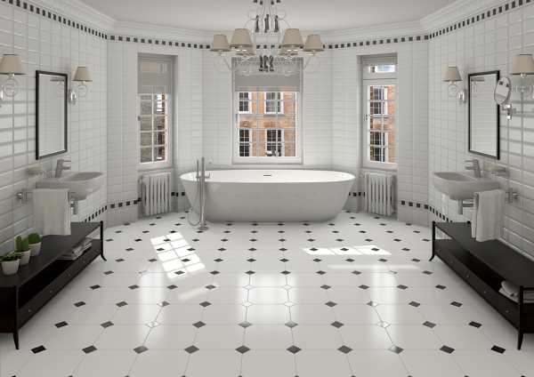 В классическом варианте для пола темный цвет и хорошо, если он будет того же оттенка, что и плитка, находящаяся внизу стены. При выборе светлого материала для отделки пола можно добиться большей зрительной глубины помещения, а также усилить контрастность.