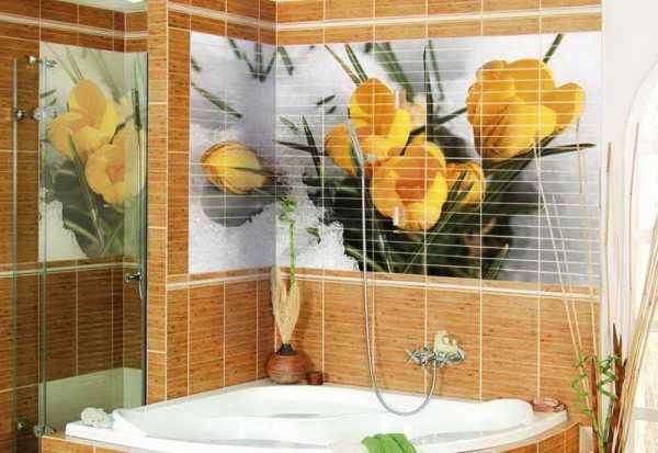 Если размеры ванной комнаты сравнительно большие, то в этом случае для облицовки стен можно использовать плиточное или мозаичное панно (уже готовое), которое позволит создать красивый луг или морские глубины.