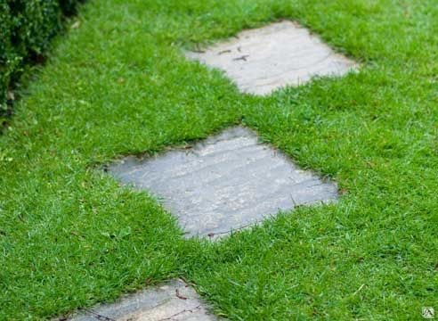 Хорошо смотрятся на даче плиты, между которыми растет газонная трава. Такая дорожка делается на готовом газоне: вырезается дерн, дно ямки заполняется песком, чтобы плита была на одном уровне с травой.