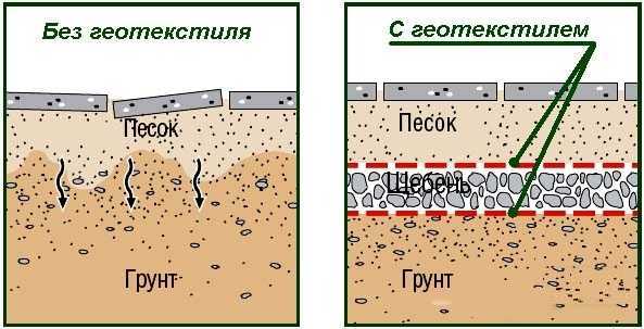 Дно траншеи уплотняют и кладут геотекстиль. Его укладывают также и между слоями – это повышает прочность основы и срок ее эксплуатации, так как материал специально создан для строительства в условиях вечной мерзлоты. Он очень крепкий и препятствует вымыванию песка, проседанию, исключает разрастание сорняков и хорошо пропускает влагу.