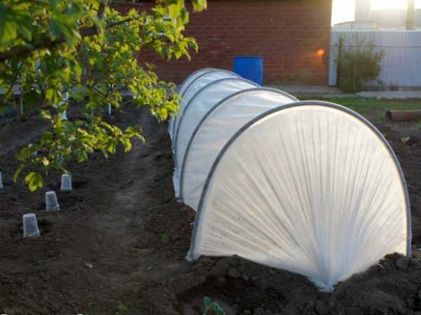 - для защиты наземной часть растений. Защищая растения, их покрывают полностью, сооружая над ними каркас с натянутым материалом. Возможно обойтись и без каркаса и опор, если полотно накинуть поверх растений, а его края присыпать грунтом;