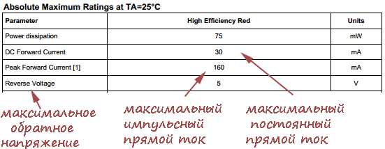 Максимальная мощность рассеяния, максимальные значения постоянного и импульсного прямых токов и максимальное обратное напряжение. Эти характеристики показывают предельные значения напряжений и токов, которые не стоит превышать. Они описаны в даташите в разделе Absolute Maximum Ratings.