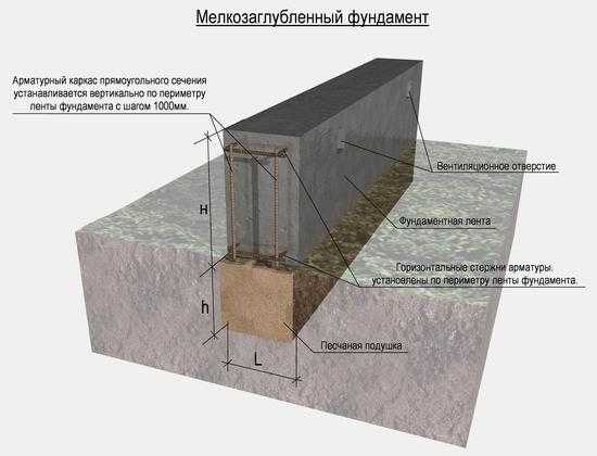 - Мелкозаглубленный ленточный фундамент подойдет для грунтовых условий с залеганием плывуна ниже отметки промерзания грунта.
