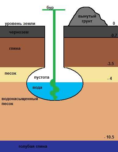 Чтобы решить такую проблему нужно применять обсадную трубу. Которая не даст песку обваливаться, и бур пойдет потихоньку вниз. Полости при этом не будет. Обсадную трубу нужно периодически забивать все глубже и глубже. На рисунке я пририсовал обсадную трубу красным цветом.
