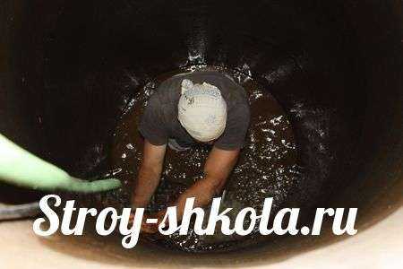 - Используйте скребок для очистки стен шахты от плиты. В роли этого вы часто используете мотыгу для работы в саду на двухметровой ручке. Верхние кольца очищаются от земли, затем используйте лестницу.