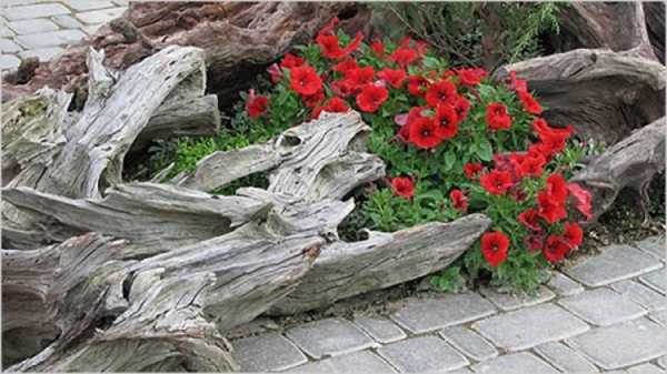 Умельцы сооружают клумбы из дерева для сада и огорода, используя для этого различные полешки, которые выкладывают в шахматном порядке. Таким образом, можно отгородить место для новой клумбы или обновить уже имеющуюся для того, чтобы ее не перемещать. Из дерева делают небольшой штакетник вокруг клумбы. Его можно покрасить в яркие цвета или оставить в натуральном виде, все зависит от общего стиля оформления.