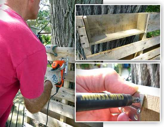 Начинаем! Наш поддон подготовим и вскроем лаком. Сзади нужно прибить еще несколько горизонтальных досок. Теперь плотно закроем заднюю часть брезентом и закрепим стиплером по всему периметру.