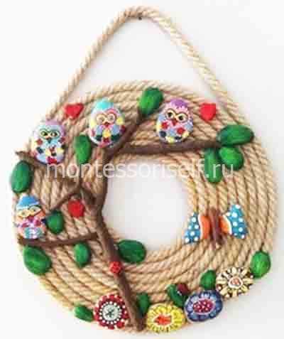 Основа для панно может быть скручена из веревки, которая приклеивается по кругу слой за слоем. Уже на нее приклеиваются камушки, раскрашенные под птичек и цветочки.