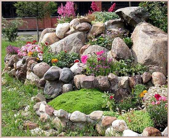Клумба с камушками. Прекрасные композиции из цветов, окруженных камнями. Смотрится ухоженно, при минимальных трудовых затратах.