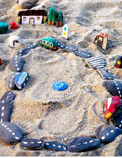 Ребятишки младшего возраста с удовольствием превратят камушки в разноцветный строительный материал – для этого достаточно покрыть их поверхность яркими разноцветными полосками или белыми штрихами.