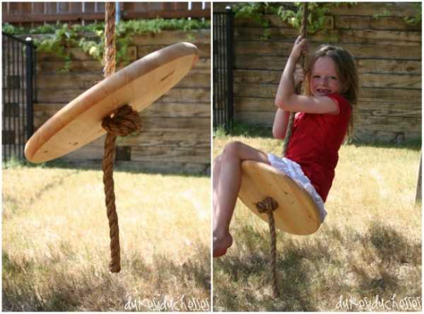 Дети наверняка обрадуются таким качелям, которые еще и очень просто смастерить. Всего-то нужно кругляш и веревка.