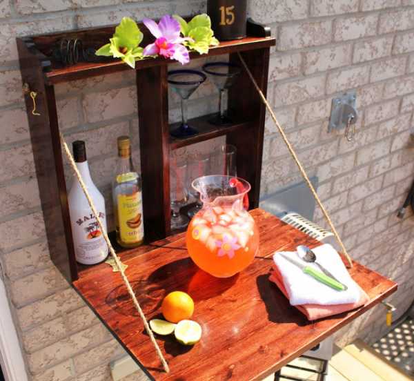 Для уличных посиделок есть такая идея: небольшой ящик на стене, в котором можно хранить любимые напитки, а крышку использовать как рабочую поверхность. Идеальное приспособление из старой мебели.