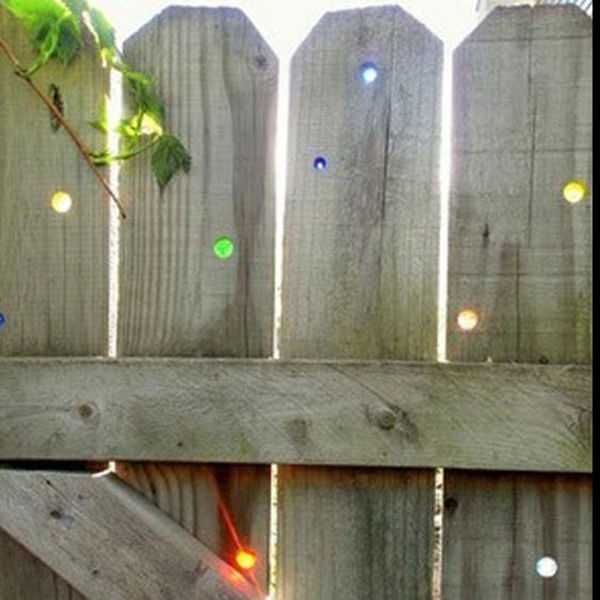 Похожая идея с выпиливанием — только в дырочки вставлены обычные марблсы — и забор может засиять всеми цветами радуги на солнышке.