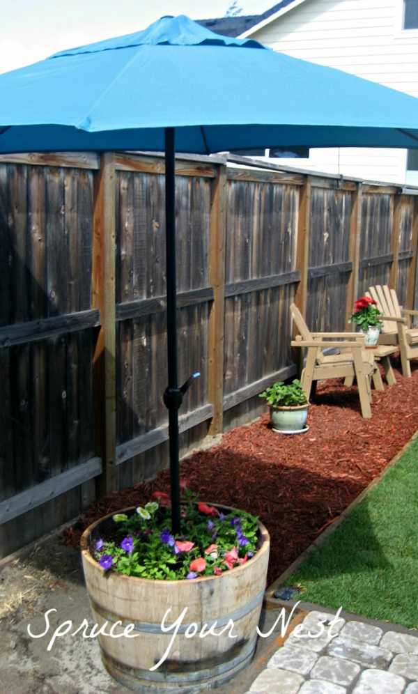 Защита от солнца может выглядеть стильно — возьмите старую бочку или кадку, установите в нее зонт, насыпьте плодового грунта и посадите однолетники.