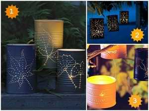 - Создайте незабываемую романтическую атмосферу летним вечером, изготовив из жестяных банок удивительные подсвечники. Для начала нарисуйте на банках простой узор, наполните банку песком, добавьте воды и поставьте на несколько часов в морозилку. Затем пробейте шилом или гвоздем дырочки, при этом замерзшая вода с песком не дадут банке деформироваться. Приложите немного усилий, и ваш подсвечник готов. Сделайте несколько таких подсвечников, а затем покрасьте. Их можно подвесить или поставить на стол, на крыльцо, в траву возле дома.