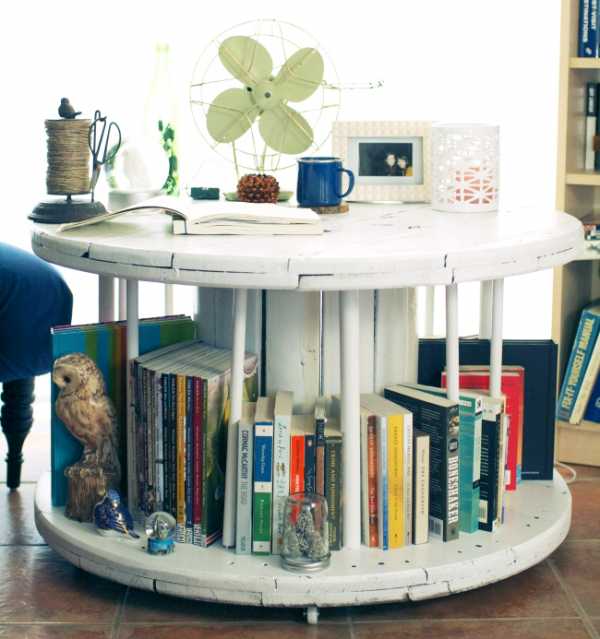 Очень необычно выглядит круглый стол из старой катушки от кабеля.