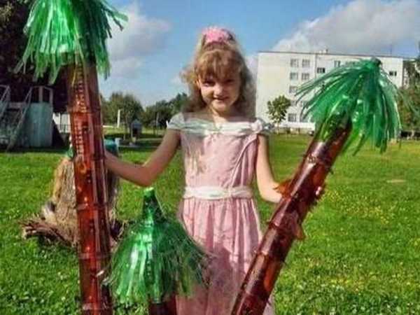 Важно знать, что большинство поделок из пластиковых бутылок, связанных с деревьями, выполняются по аналогичной схеме. В работе понадобятся — пластиковая бутылка, ножницы, краска для пластика и проволока. Выполнение пальмы происходит с использованием средних и нижних участков бутылок темного цвета, листву целесообразно сделать из бутылок зеленого цвета. В пластиковую бутылку со срезанным дном вставляется следующая аналогичная бутылка, пока не будет сформирована необходимая высота. Все элементы нанизываются на проволоку, проходящую сквозь горлышко, на верхушку крепится горлышко зеленой бутылки без дна. Далее равными частями нарезаются полоски из зеленого пластика и наклоняются к низу, имитируя пальмовую листву.
