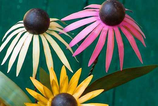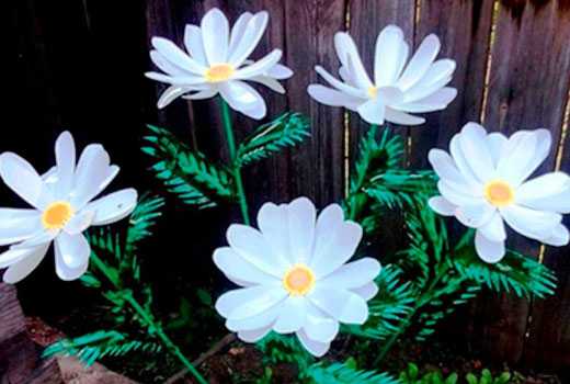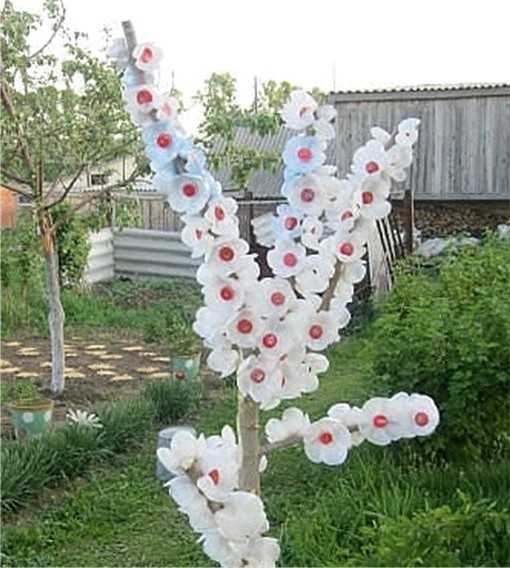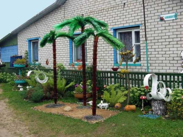 Самое яркое украшение во дворе – это цветы. Из пластиковой тары они получаются замечательно и уже придумано немалое количество примеров. О том, как мы украшаем участок с помощью цветов, для Вас подготовлена отдельная статья. Хотите соорудить своими руками дерево из бутылок? Это возможно! Предлагаем Вам ознакомиться с мастер-классом о том, как сделать пластиковую пальму. Если пластиковую самоделку из ненужной тары необходимо покрасить, почитайте наш материал на эту тему.
