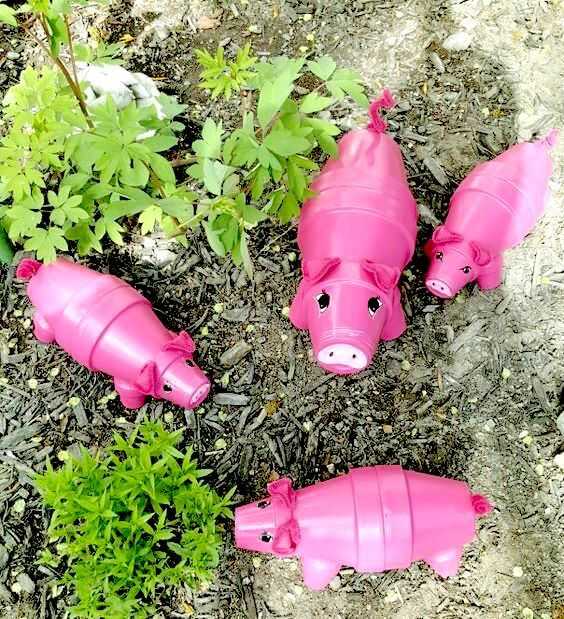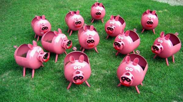 Свинки на даче из пластиковых бутылок – классика жанра. Конечно, для изготовления упитанной свинки лучше всего подойдет 5-литровая емкость. Ее часто используют в качестве кашпо. Приемы сборки хрюшки точно такие же, как и для ослика. Описание об этом следует далее.