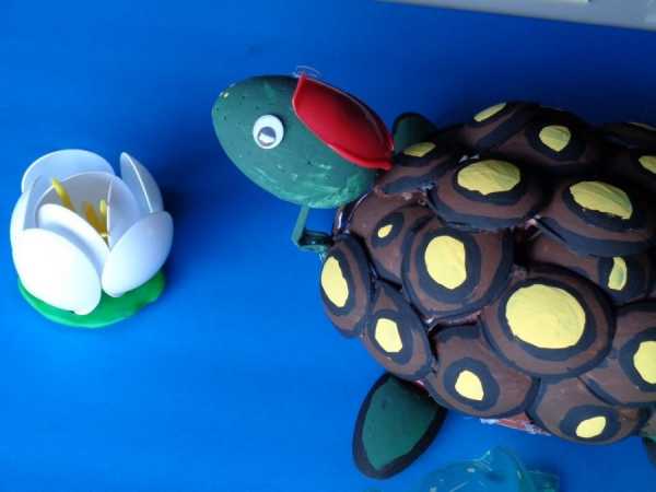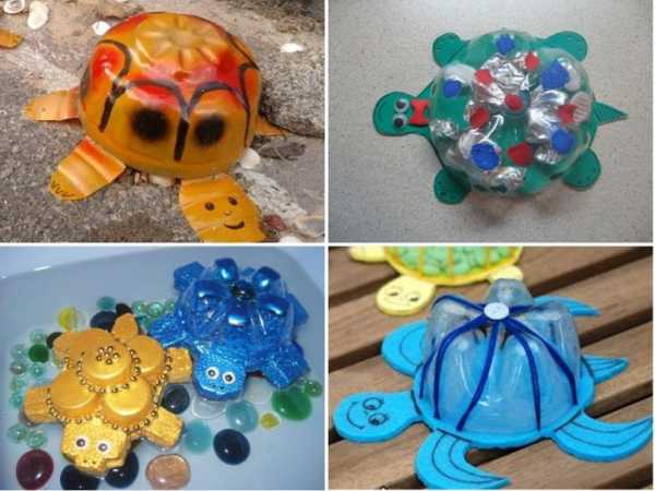 Перед Вами несколько вариантов конструкций черепахи. Все они изготовлены из донышка бутылки, которое напоминает панцирь земноводного. Используя краски и прочие элементы декорации, можно создать черепаху с «собственным лицом».