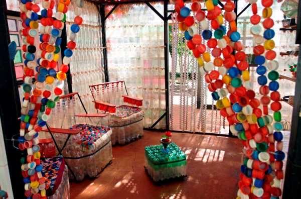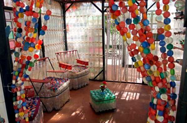 И самое занятное, что нам удалось найти: в самом начале статьи мы рассказывали, что из бутылок запросто можно сделать беседку для летнего отдыха в саду. Но этот умелец пошел дальше и изготовил не только саму беседку, но и всю обстановку в ней исключительно из бутылок. Это и стены, и кресла с журнальным столиком, и занавеска, и элементы декора. Как вам идея?