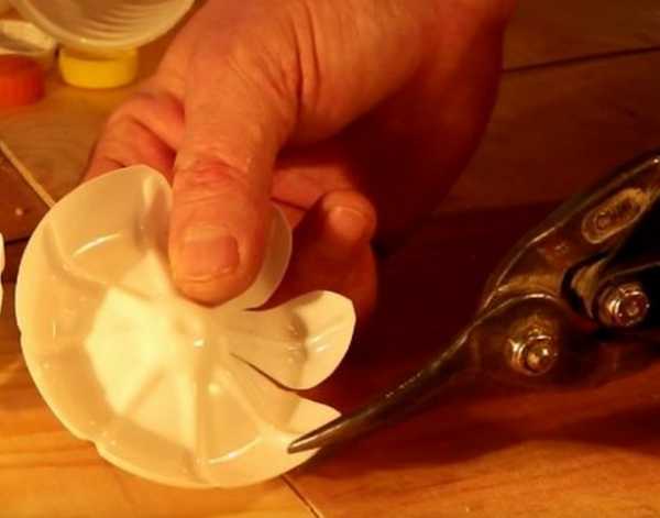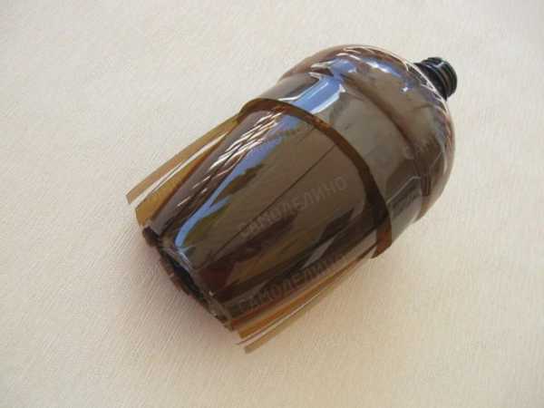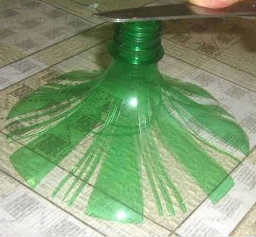- Сначала подготовим четыре заготовки из верхней части бутылок. Одна из них с горлышком, другие должны свободно надеваться на первую. Прорезаем их полосами с шагом 10мм. Прорези пересекают линию изгиба верха бутылки и не достигают края детали не менее 30мм.