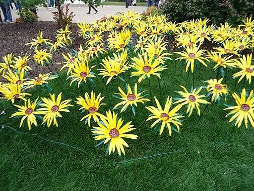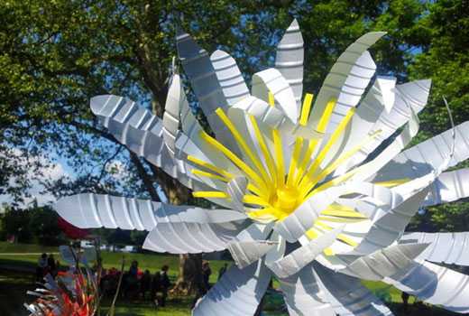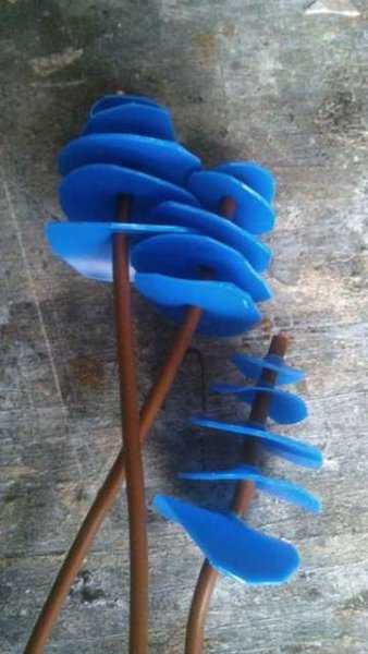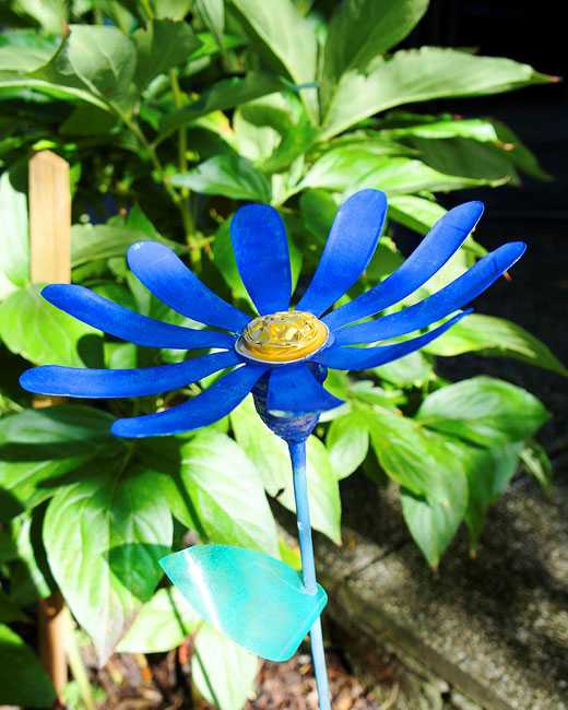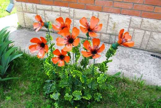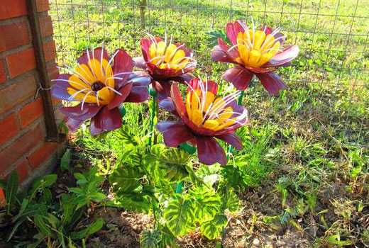 Собственно, никаких особых шагов тут нет — отрезаем или донышко или горлышко, в зависимости от того, какой именно цветок вы хотите сделать, и ножницами формируем лепестки. Далее красим лаком или краской. Из зеленых бутылок делаем стебель и листья, собираем с помощью клея или проволоки в единую конструкцию и «сажаем» цветы на клумбу. Таким способом можно сделать маки и колокольчики, ромашки и гладиолусы, ирисы и розы, незабудки, гвоздики, тюльпаны и многие другие цветы, которые будет не сложно узнать.