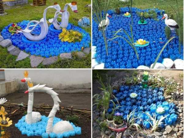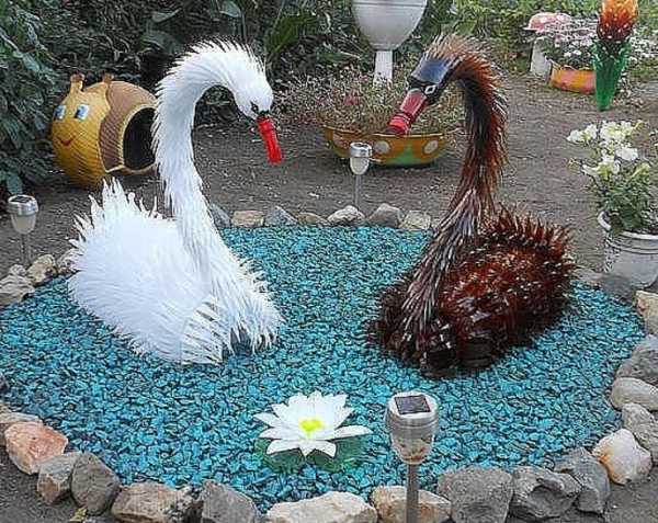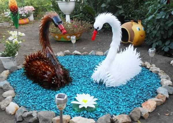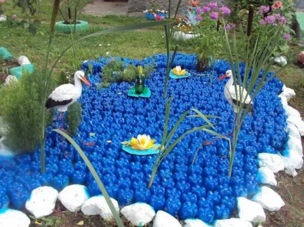 Голубое озеро во дворе наиболее реально устроить из пластиковых бутылок. Его поверхность, даже в отсутствие ветра, покрывает характерная рябь. Сделать такой пруд проще простого. Нужно покрасить не менее 100 бутылок голубой краской изнутри, а затем зарыть в землю горлышком вниз. Для декора пруда подойдут цветы и лебеди, изготовленные из того же материала по рекомендациям наших статей.