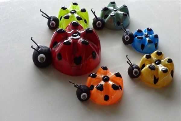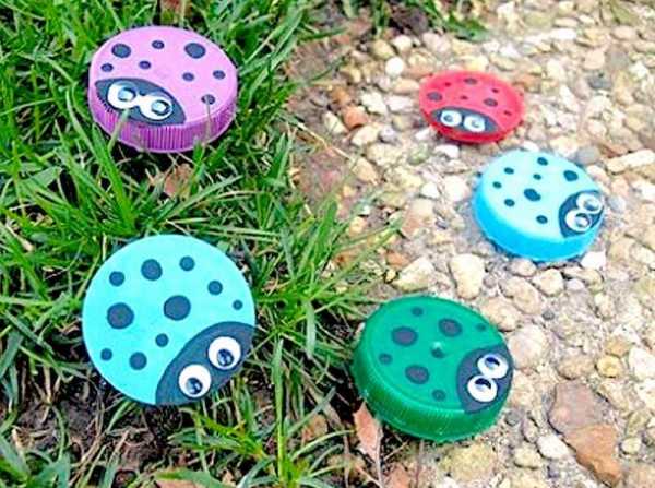 Также из бутылок можно сделать различных насекомых, так что не торопитесь их выбрасывать. За зиму как раз можно насобирать достаточно материала для летних поделок. Лидер тут, конечно, божья коровка. Ее очень просто сделать из донышка пластиковой бутылки, пошаговый мастер класс даже не требуется — просто отрезаете донышко, делаете из крышек или какого-нибудь шарика голову с рожками из проволоки, красите в красный или любой другой цвет, рисуете точки и глазки — вот поделка и готова: