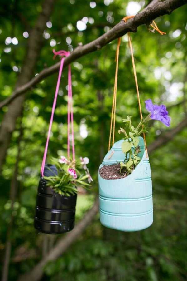 Также бутылки из пластика можно использовать в качестве настольных и подвесных горшков. Если отрезать у бутылки дно – выйдет цилиндрическое кашпо, при использовании верхней части — получится конусообразное. Если такие горшки декорировать цветной гофрированной бумагой, тканью, пряжей, просто разукрасить — появится незабываемый элемент интерьера. Слегка подогретому пластику легко будет придать абсолютно любую форму, это дает возможность создать самые необыкновенные цветы.