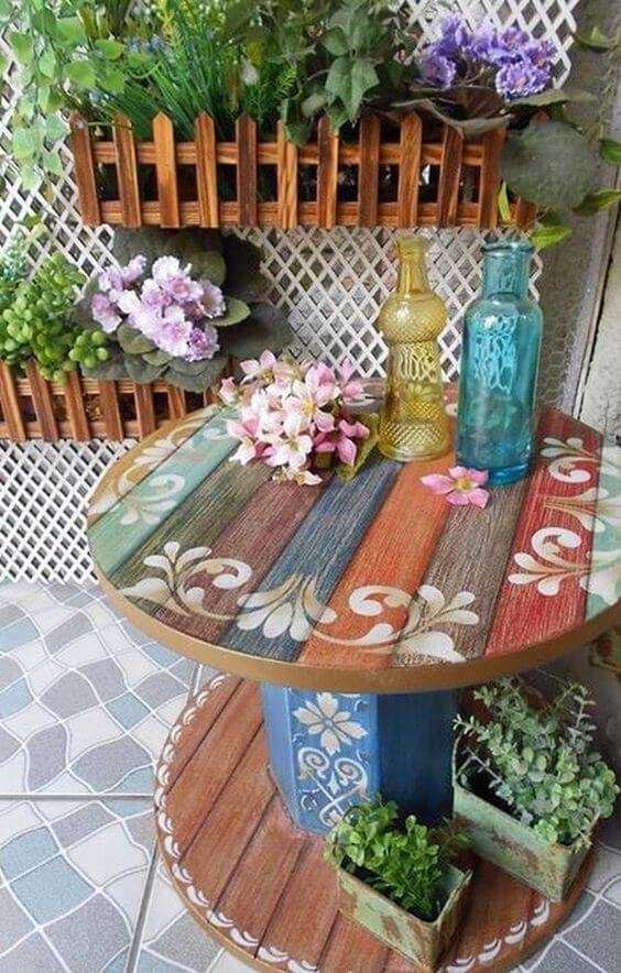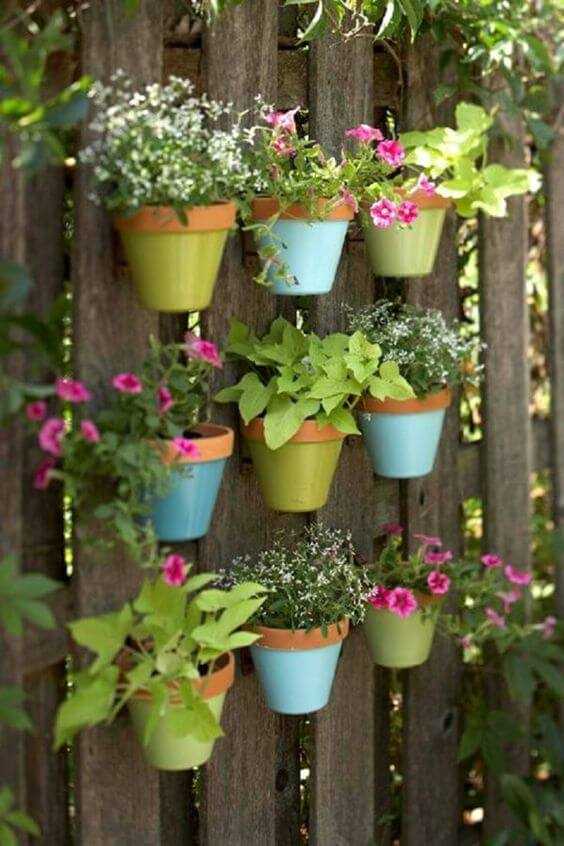 Разукрасив деревянный поддон всеми цветами радуги, можно создать оригинальную стенку держатель для горшков с цветами