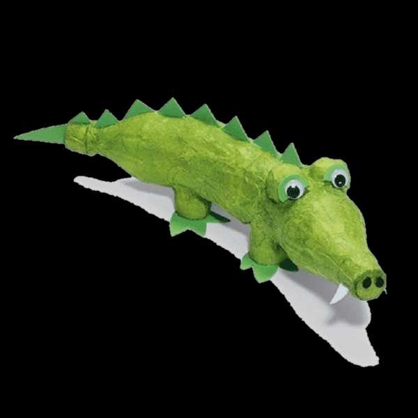 Соединив между собой две пластиковые бутылки и обмотав их фольгированной цветной бумагой можно получить забавного крокодила