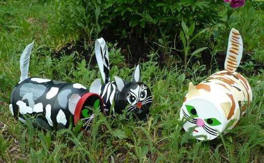 Делать поделки из бутылок совсем не сложно, найти материал может каждый в любом количестве, а разноцветные краски позволят придать жизнь поделкам. Поэтому главная проблема, которая может перед вами возникнуть — что именно сделать? Почему бы и не животных? Вот, например, кошки, мышки и пингвины, сделанные для украшения участка: