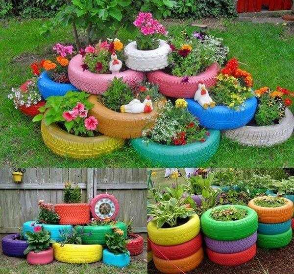 Оригинальная альпийская горка из автопокрышек в роли клумб для цветов