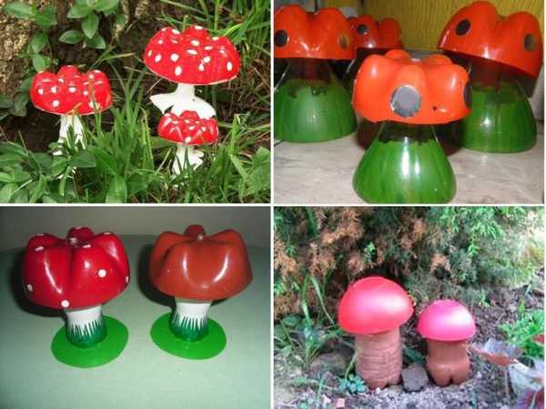 Наверное, самые легкие в изготовлении поделки из пластиковых бутылок, — это грибы. Своими руками делаются грибочки чрезвычайно просто и очень похожи на настоящие. Шляпка гриба – это дно бутылки, его ножка – верхушка емкости. Их следует раскрасить по своему усмотрению. Скрепить обе части удобнее всего саморезом.