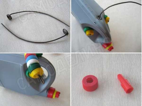 - Насаживаем оба горлышка сборки на деревянный черенок и закрепляем двумя саморезами. Для одного из них пришлось прорезать отверстие в верхней детали.