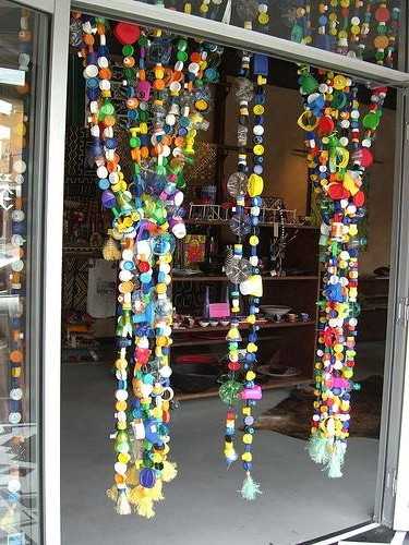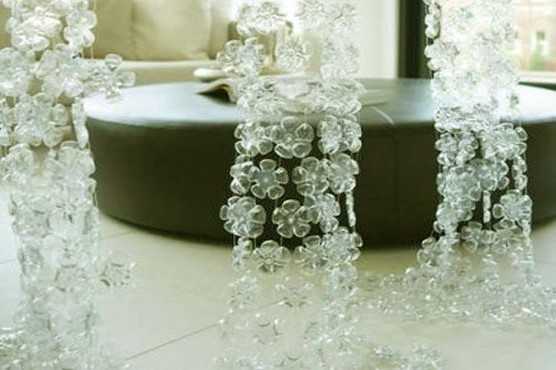 Занавески из пластмассовых бутылок на окнах либо в дверных проемах – интереснейшее дизайнерское решение. Для их создания придется взять большое количество этих самых пластиковых бутылок – прямо пропорционально размеру окна (либо дверных проемов). Отрезанные донышки от емкостей (незначительной высоты) необходимо соединить между собой. В качестве крепежа подойдут леска или тонкая проволока. Необычная композиция из бутылок получится, если взять бутылки различных размеров и цветов. Если есть желание и время, незабываемое ощущение создаст занавеска из прозрачных одинаковых бутылок, раскрашенная акриловыми красками.