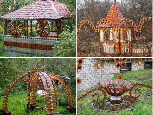 Очень легко можно из пластиковых бутылок создать для дачи и полезные мелочи, и ландшафтные произведения, включая клумбы, беседки, опоры для парников и навесов, каркасы для вьющихся растений и т.д.