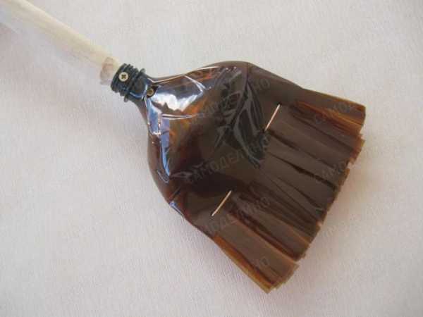 Собирая поделку, мы ставили задачу использовать поменьше бутылок и получить метелку достаточной жесткости. Однако она получилась недостаточно широкой. Для решения этой проблемы следует использовать для заготовок всю длину бутылки.