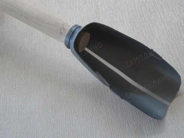 Вместе с метлой мы изготовили совок из пластиковой емкости. Для реализации такой идеи лучше использовать канистру из толстого пластика. Вырезаем деталь в соответствии с изображением, насаживаем на деревянную ручку и получаем совок. Землю совок не копает, но для песка и цемента годится и с нашей метлой в паре работает!