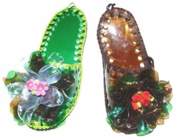Оказывается, из пластиковых бутылок можно сочинить очаровательные тапочки. Как сделать цветочки, мы уже рассказали в специальной статье. Остальное и так понятно.
